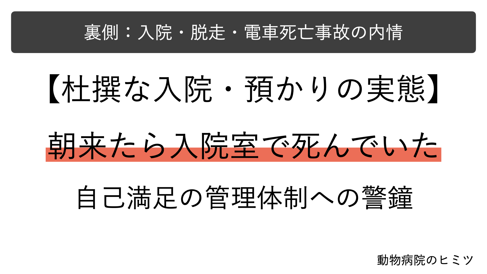 このような痛ましい事件・事故が今後起きないようにという想いを込めて、現在の動物病院・ペットホテルの杜撰な管理状況について詳らかに実態を明らかにする。